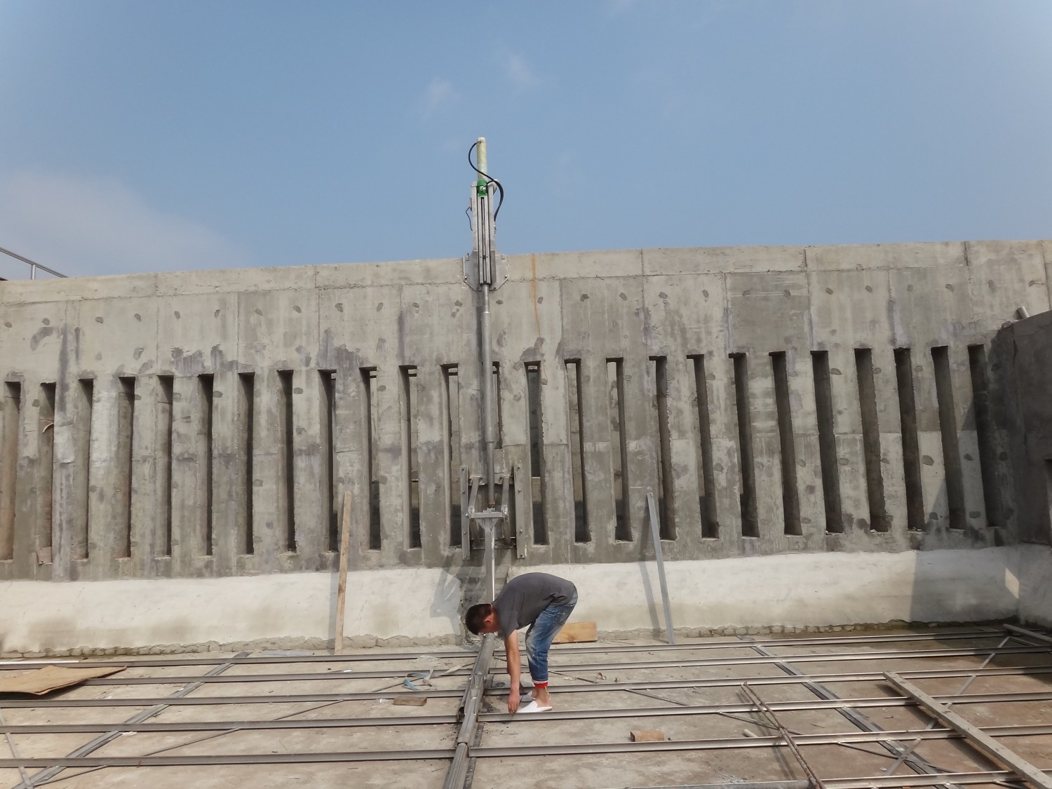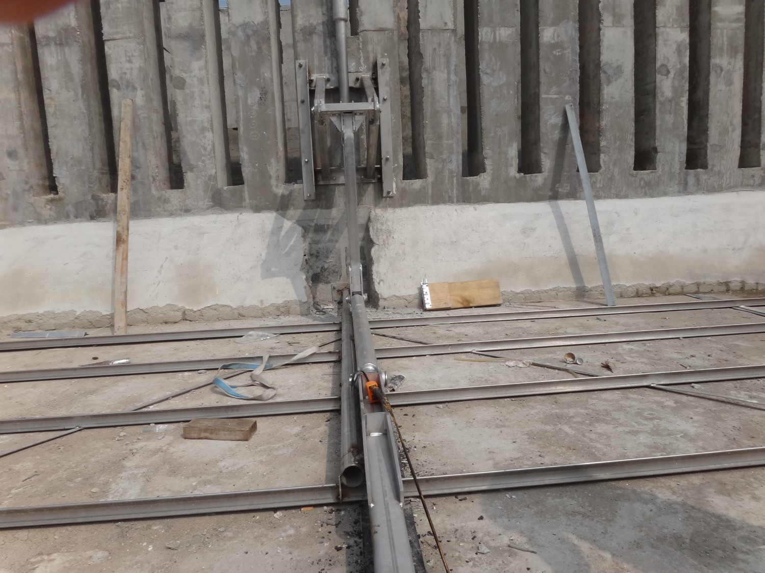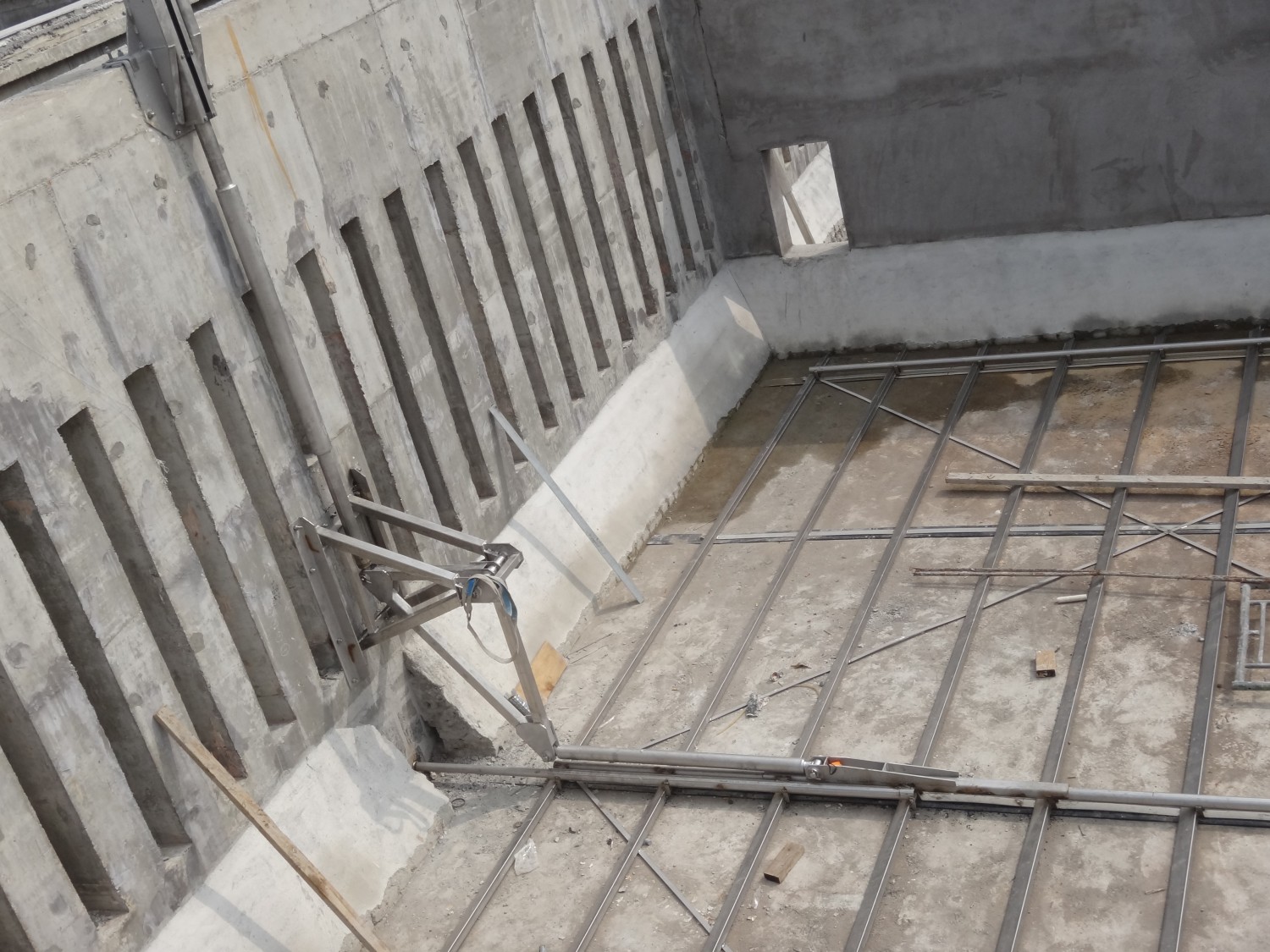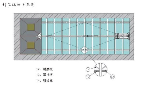 刮板在液压动力驱动下在池底前后连续往复式运动,当刮板向前移动式,污泥在楔形凹面与污泥在同一方向上,从而推动污泥向前运动;返回时,楔形点插入污泥层,刮板返回速度大于前进的速度,因此污泥在刮板上面向泥沟流动,使得污泥输送不间断。