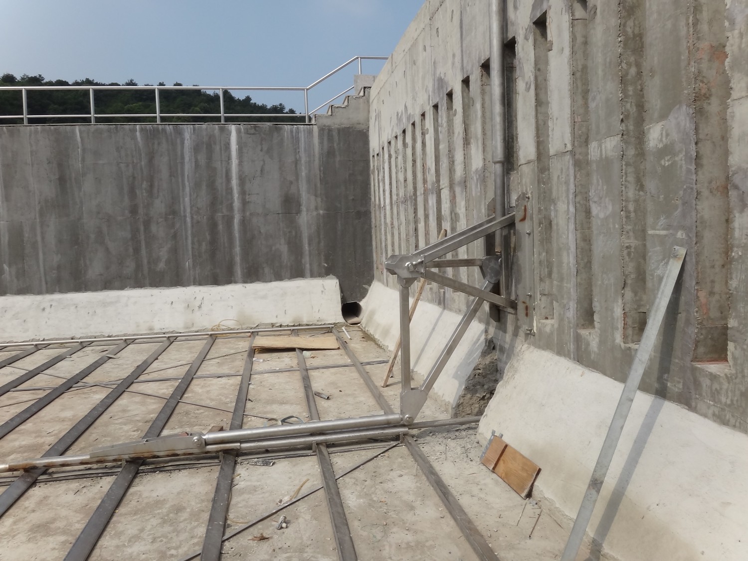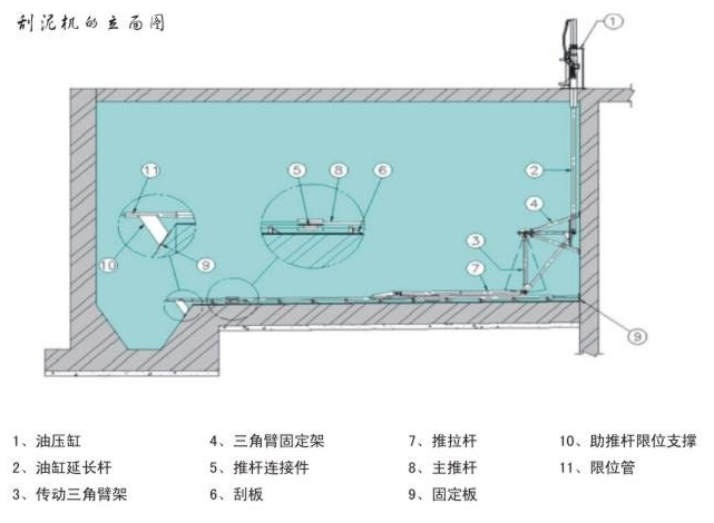 液压传动系统装置带动推杆运动,推杆带动刮板运动,刮板以往复式运动,将污泥挂送至污泥坑后排至污泥池。